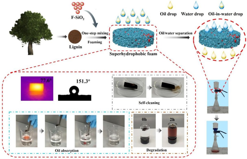 Superwettability can affect the performance of oil separation from water during the treatment of oily wastewater. Among various types of materials developed for cleaning oil pollution, foam is a popular choice due to its attractive lightweight properties and adjustable porosities. Foams with superwetting surfaces (superhydrophilic/superoleophobic underwater) are ideal for oil/water separations. In this study, lignin-based polyurethane foams (LPUFs) were synthesized first, and then polydopamine particles were deposited on the surface of the foam by in situ polymerization under weak alkaline conditions to increase its surface roughness. Afterwards, phytic acid was used to modify the foam to achieve surface superhydrophilicity and underwater superoleophobicity. Successful loading of polydopamine (PDA) particles and coating of phytic acid (PA) onto the foam was demonstrated by SEM, EDS, FTIR, XPS, and thermogravimetric analysis measurements. It was shown in the cyclic compression tests that LPUFs had good mechanical properties. Under 75 % compression strain, the maximum stress in the first cycle of LPUF/PDA/PA was 105.92 kPa. After 30 cyclic compression tests, the maximum stress of LPUF/PDA/PA under 75 % compression strain was 105.63 kPa, demonstrating a high mechanical stability. The contact angle of the foam modified by PDA and PA was 0° for water, 166.7° for chloroform, and 158.4° for hexane, which also demonstrated excellent underwater anti-oil adhesion performances. Oil-water separation tests by using PDA and PA modified lignin-based foam with mixtures of water and n-hexane, cyclohexane, toluene, and pump oil indicated a separation efficiency of over 99 % for the types of mixtures tested together with excellent repeatability. In addition, the PDA and PA modified lignin-based foams were able to adsorb 67.1 mg/g of methylene blue, 96.1 mg/g of rhodamine B, and 98.2 mg/g of copper sulfate. The lignin-based foam could completely degrade under weak alkaline conditions after usage. This study highlighted a novel strategy for synthesizing environmentally friendly high-performance adsorbents to efficiently treat polluted wastewater using lignin as a raw material.