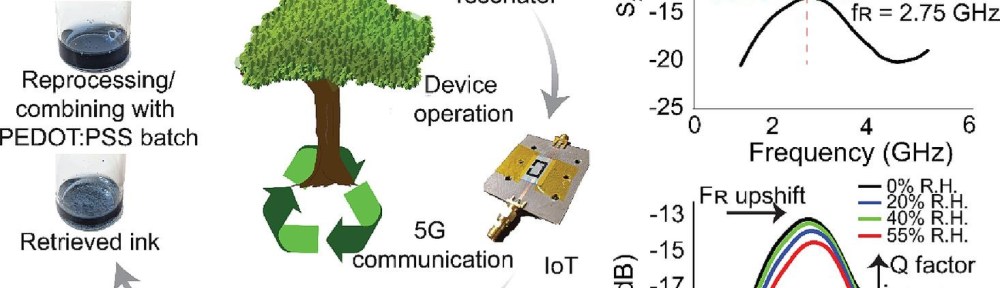 The rapid development of electronics has caused the accumulation of electronic waste that is threatening the environment and human health. The deployment of the Internet of Things (IoT), enabled by 5G microwave communication technology, will involve an increasing number of electronic devices. Microwave communication devices consist of petroleum/ceramic-based substrates and metallic traces that are non-biodegradable. Here, we report a smart, flexible, and transient organic microwave resonator (TOMR) using cellulose nanofibrils (CNF) nanopaper as substrate and poly(3,4-ethylenedioxythiophene):polystyrene sulfonate (PEDOT:PSS) as conducting trace. The device produced a resonant profile with the maximum transmission coefficient (S21) amplitude of −14.95 dB at a resonant frequency of 2.75 GHz under ambient conditions (20 °C, 30% relative humidity (RH)). The TOMR demonstrated sensing capabilities, wherein increasing the %RH modulated the device’s resonant amplitude (-29 mdB/%RH from 0% to 50% RH and −90 mdB/%RH from 50% to 90% RH) and resonant frequency (3600 kHz/%RH). Moreover, the PEDOT:PSS trace could be reclaimed, recycled, and redeposited on a CNF nanopaper, which enabled the fabrication of a TOMR that displayed a similar resonant profile. Hence, this study demonstrates the first transient organic microwave resonator embedded with sensing capabilities and introduces a framework to minimize the environmental impact of 5G microwave communication devices for the IoT.