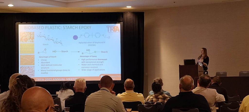 Ph.D. Candidate Nicole Tratnik won first prize in the Excellence in Thermoset Polymers Research Competition hosted by the Thermoset Resin Formulators Association for her paper titled “Recyclable, self-strengthening starch-based epoxy vitrimer facilitated by exchangeable disulfide bonds”. She was flown out to Denver, CO to present her work at the TRFA Annual Meeting with over 120 attendees. Her award-winning paper can be found here.