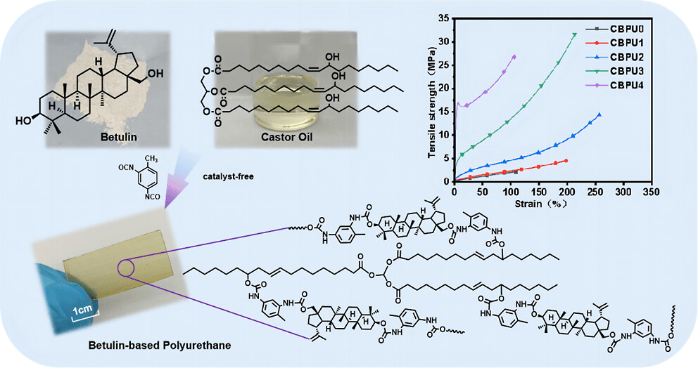 Using sustainable biomass feedstock to prepare biobased chemical products is attracting increasing attention. Betulin is a natural cyclic aliphatic diol that can be extracted in large quantities from the bark of birch trees. In this study, a series of bio-based polyurethane (PU) elastomers with excellent mechanical properties, solvent resistance, and thermal stability were synthesized under catalyst-free conditions using betulin and castor oil (CO) as the bio-based polyols. The chemical structure and properties of the bio-based PU elastomers were systematically investigated according to the effect of the hydroxyl ratio between betulin and CO. Due to the presence of abundant hydrogen bonds and rigid ring planes in the PU structure, and a higher cross-link density, the obtained PU elastomers had excellent mechanical properties. They achieved a maximum tensile strength of 31.6 MPa with the tensile strain reaching more than 200% and were able to withstand 1 × 105 times their weight. The thermal decomposition temperature of the betulin-derived PUs was over 300 °C. This study showcased a strategy to synthesize sustainable high-performance PU materials with a high biomass content (>75%).