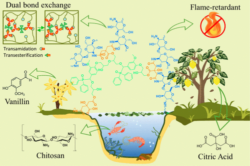 The front cover art for the manuscript: “Catalyst-Free Biodegradable Chitosan-Based Dual Dynamic Covalent Networks with Self-Healing and Flame-Retardant Properties” by Mohammad Mahaninia and Ning Yan has been published in ACS Sustainable Chemistry & Engineering.