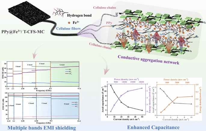 In an era where technological advancement and sustainability converge, developing renewable materials with multifunctional integration is increasingly in demand. This study filled a crucial gap by integrating energy storage, multi-band electromagnetic interference (EMI) shielding, and structural design into bio-based materials. Specifically, conductive polymer layers were formed within the 2,2,6,6-tetramethylpiperidine-1-oxide (TEMPO)-oxidized cellulose fiber skeleton, where a mild TEMPO-mediated oxidation system was applied to endow it with abundant macropores that could be utilized as active sites (specific surface area of 105.6 m2 g−1). Benefiting from the special hierarchical porous structure of the material, the constructed cellulose fiber-derived composites can realize high areal-specific capacitance of 12.44 F cm−2 at 5 mA cm−2 and areal energy density of 3.99 mWh cm−2 (2005 mW cm−2) with an excellent stability of maintaining 90.23% after 10,000 cycles at 50 mA cm−2. Meanwhile, the composites showed a high electrical conductivity of 877.19 S m−1 and excellent EMI efficiency (> 99.99%) in multiple wavelength bands. The composite material’s EMI values exceed 100 dB across the L, S, C, and X bands, effectively shielding electromagnetic waves in daily life. The proposed strategy paves the way for utilizing bio-based materials in applications like energy storage and EMI shielding, contributing to a more sustainable future.