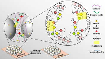 To enhance the performance and durability of lithium-ion batteries, the development of effective binder materials in the anode is crucial, with eco-friendliness being an additional consideration. This study presents a bio-based and self-healable polymeric binder designed for use in graphite-based anodes to achieve enhanced battery performance. The binder was synthesized via a Schiff base reaction between chitosan and a vanillin-derived linker, forming imine bonds that establish a self-healable 3D network. The bio-based binder effectively holds the graphite particles together while also providing excellent mechanical strength, thermal stability, and strong adhesion to the copper foil. Notably, it demonstrated self-healing behavior, with mechanical recovery exceeding 90 % after damage. Thermogravimetric analysis confirmed high thermal stability up to 300 °C, while the binder exhibited excellent tensile adhesion strength (ca. 21 kPa). Both coin and pouch cells fabricated with the bio-based binder achieved a specific capacity of 161.2 mAh g−1 and retained 81 % of their capacity after 250 cycles. Coulombic efficiency remained consistent at above 92 % even after 250 cycles, indicating no side reactions. Even at a high current density of 1.0C, the cells maintained approximately 50 % of their original capacity measured at 0.3C, showcasing excellent rate capability. Electrochemical impedance spectroscopy revealed low interfacial resistance, further validating the stability of the chitosan-based binder. We anticipate that this class of bio-based binders will not only extend the service life of lithium-ion batteries but also make a significant contribution to greener, safer energy storage technologies.