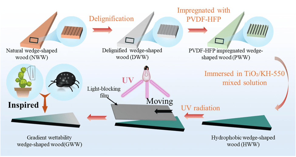 Inspired by cactus spines and desert beetle structures, this work introduces a wood-based wedge-shaped surface with gradient wettability that enables controlled, spontaneous directional liquid transport. By combining wood’s natural anisotropic porous structure with targeted surface modification, the design guides liquid motion through the synergy of geometry and surface energy gradients. We further demonstrate its potential in a fog-driven device concept, highlighting opportunities for sustainable water management, energy harvesting, and microfluidic applications. Article available via link: Bioinspired wood-based wedge-shaped surface with gradient wettability for enhanced directional liquid transport and fog harvesting – Materials Horizons (RSC Publishing)