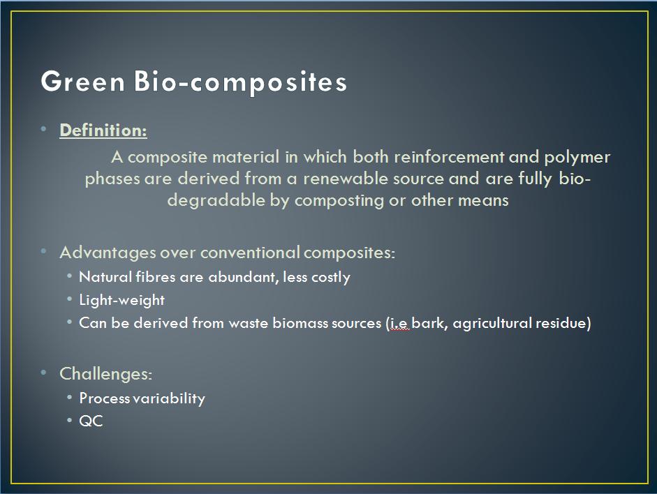 Wood and other bio-fibers have the advantages of having relatively high stiffness, low density, moderate cost over other glass and inorganic fibers. More importantly, they are renewable and nearly carbon neutral. Bio-fiber composites can be used to replace conventional glass fiber reinforced composites in some building and automotives applications. However, there are a number of technical challenges related to this type of composites limiting their usage in more demanding higher end structural applications. Key issues include interface incompatibility, high moisture absorption, poor dimensional stability, and other processing related problems. Over the years, we have done a number of studies to understand the relationship between composite structure and performance and to enhance the interfacial adhesion. Currently we are working on using nano-clay to improve dimensional stability and thermal stability of the bio-fiber composites and investigating the effect of composite processing conditions on fiber characteristics. Work is also underway to combine biofibers with biopolymer to develop novel green biodegradable composites.